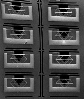 | Rice University researchers invented a micromechanical device on a silicon chip with the ability to measure the tensile and the interface strength of single nanotubes embedded in epoxy. Hundreds of devices can be constructed on a single chip. (Credit: Jun Lou lab/Rice University) |