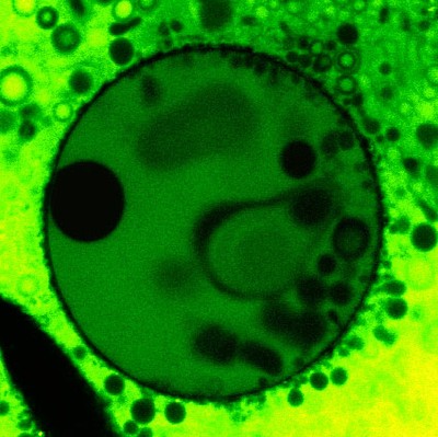 | This false-color confocal image shows fatty-acid liposomes compartmentalized in a clay vesicle. The clay vesicles are approximately 100 microns in diameter, and the pores in the clay tend to range in size from about 50 to 100 nanometers (nm), with a very small percentage of vesicles able to exclude molecules as small as 17 nm. Fatty acid molecules, thought to be the components of primitive organic cell membranes, have been shown to travel through the pores into the vesicle and automatically assemble into micron-sized liposomes. Photo courtesy of Anand Bala Subramaniam. |