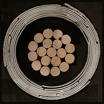 | Cross-section of a high-temperature superconducting cable design invented at NIST. In the center are copper wires bundled with nylon and plastic insulation. The outer rings are a series of superconducting tapes wrapped in spirals around the copper. The cable is 7.5 millimeters in outer diameter. Credit: van der Laan/NIST |