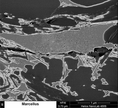 | Image of a Marcellus shale sample with nanoscale pores visible within organic matter, taken using a Helios system from FEI |