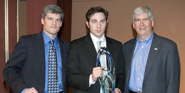 | From left to right: U-M Technology Transfer mentor Nick Cucinelli, left, with first place winner Nick Moroz and Gov. Rick Snyder U-M Photo Services / Eric Bronson |
