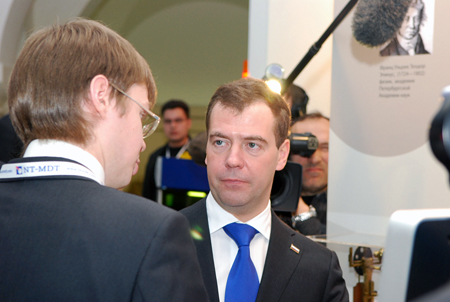 The President of the Russian Federation Dmitry Medvedev opened the First Russian Festival of Science at the exhibition. The President visited NT-MDT Co. exhibit and had a brief talk with an engineer of NT-MDT Co. about the features of the SOLVER NEXT.