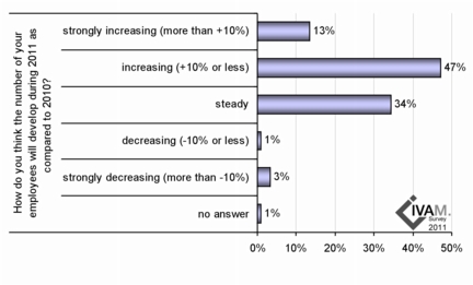 According to the survey conducted in January 2011, 60% of the mostly small and medium-sized companies intend to hire new staff during the year 2011. This means that the positive post-crisis trend, which has made itself felt in 2010 already and which can be observed in other industries as well, will continue in 2011. While in 2009 only 26% of companies reported an increase in the number of employees, no less than 44% have hired new staff in 2010.