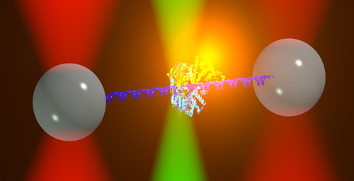 combines optical traps (red) with fluorescence (green) to study the proteins that regulate DNA.