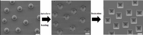 | Erik Hsiao Localized etching of a silicon (100) wafer upon hydrolysis of amidine-functionalized polystyrene latex colloids. The nanowell size can be precisely controlled with the size of the APSL colloids. No etch mask is needed and the region outside the nanowells is not etched at all. Scale Bar = 500 nm. |