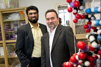 | Samir Iqbal (left) electrical engineering assistant professor, and Shawn Christensen, assistant professor in biology, work on a collaborative project that more accurately detects certain types of cancer. |