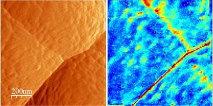 | The topographic image (left) of amorphous Si anode in the Si/LiPON/LiCoO2 thin-film battery structure shows the presence of a number of grain boundaries, as well as extensive surface roughness. The ESM image (right) is obtained by measuring the electrochemical strain hysteresis loops at each pixel (100x100 pixel image over 1 micron area). The area hysteresis loop is a measure of Li-ion mobility, and is plotted as 2D map (dark blue corresponds to closed loops, red to open loops). The enhanced Li-ion mobility along the sharp grain boundary is clearly seen, as well as localized hot spots on the diffuse grain boundary and within the grains. The effective resolution of ESM for this material is ~ 10 nm, providing a high-resolution view of Li-ion dynamics in these materials. (Reprinted from N. Balke, et al., Nano Lett. 10, 3420 (2010). |