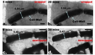 | This image shows the differences between bacteria that has been wrapped with graphene and bacteria that has not been wrapped. The images were taken after five minutes and after 20 minutes under an electron microscope, showing that the wrapped bacteria maintains a clear image. |
