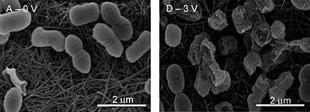 | Environ. Sci. Technol. MICROBE ZAPPER When the carbon nanotube-based filter catches bacteria (left), it can also kill them through electrolysis (right). |