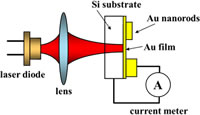 | Fig. 1 shows the structure and dimension of the gold nanorod Schottky diode photodetector, where 10 nm x 100 nm gold rods were used. Fig .2 shows the experimental set up and Fig. 3 the experimental results for light of 1500 nm, showing a significant increase in the photocurrent of the device with the gold nano rods. |