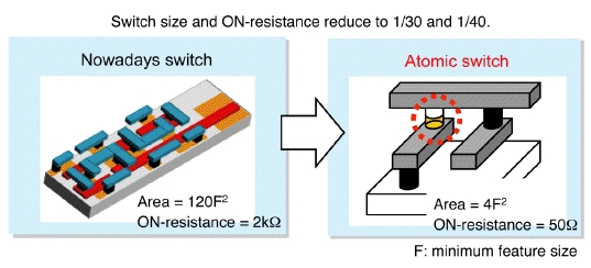 | Figure 1: Comparison between semiconductor-transistor-based and atomic-switch-based switching circuits. |