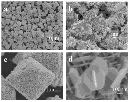 | Figure 1: Scanning electron microscope images of ZTO microstructures: (a) low magnification image of the Zn2SnO4 octahedrons; (b) ZnSn(OH)6 cubes formed in the initial stage of the reaction (note secondary nucleation on the cube surfaces); (c) a Zn2SnO4 octahedron; (d) coalescing nanoplates. (Reproduced with permission, © 2010 Elsevier B.V.) |