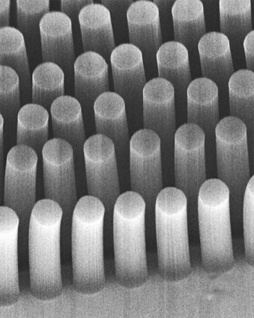 | These posts, made of carbon nanotubes, can trap cancer cells and other tiny objects as they flow through a microfluidic device. Each post is 30 microns in diameter. Image: Brian Wardle |