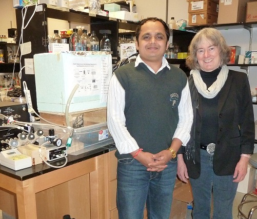 | Queen's researchers Niraj Kumar and Virginia Walker with the piece of equipment they used to measure the respiration of microbe communities living in Arctic soil samples. |
