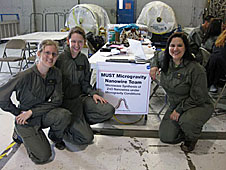 | Hannah Clevenson, Olivia Lenz and Tanya Miracle flew an experiment investigating the microwave synthesis of zinc oxide nanowires under microgravity conditions on a NASA reduced-gravity flight. Image Credit: NASA |