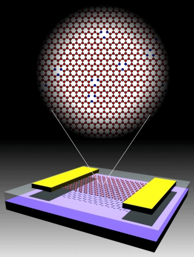 | Schematic of a graphene transistor showing graphene (red), gold electrodes (yellow), silicon dioxide (clear) and silicon substrate (black). Inset shows the graphene lattice with vacancy defects. Vacancies (missing atoms) are shown surrounded by blue carbon atoms. |