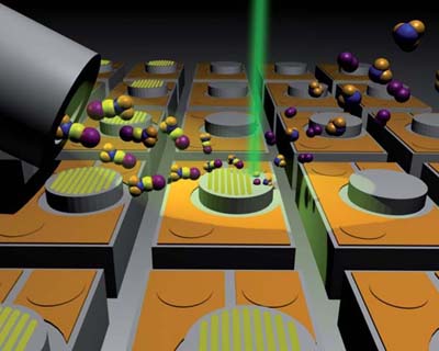 FEBIP is suitable for prototyping nanocomponents, in order to solve specific questions and problems in applied nanoelectronics, nanophotonics and nanobiology. Suitable gas molecules are injected close to a sample which is already in the microscope's vacuum chamber. These adsorb on the sample in a reversible manner. The focussed electron beam, which normally serves to make objects visible, now instead induces chemical reactions of the adsorbed gas molecules, but only at the spot where the beam strikes the surface. The resulting non-volatile molecular fragments then remain permanently on the sample while the volatile fragments are removed by the vacuum system. "With the help of a precisely positioned electron beam, it's possible to remove or apply surface structures with nanometre precision and in virtually any desired three-dimensional shapes," explains Utke.