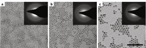 | Transmission electron micrographs and (inset) showing the electron diffraction patterns of three quantum dot samples with average size of (a) 2.4 nanometers (b) 3.6 nm, and (c) 5.8 nm. (Image courtesy of Alivisatos group) |