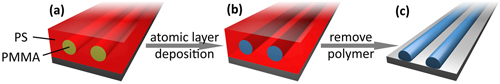 | This diagram shows the scheme for patterning inorganic nanoscale features onto the substrate by applying SIS onto a self-assembled PS-b-PMMA block copolymer film template. |