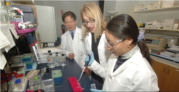 | Peixuan Guo, PhD, Dane and Mary Louise Miller Endowed Chair in biomedical engineering with students in his lab at the Vontz Center for Molecular Studies.