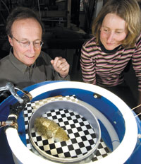 | Hanlon and Mathger: MBL Senior Scientist Roger Hanlon and Assistant Research Scientist Lydia Mäthger test the ability of a cuttlefish to adapt to a disruptive background pattern. Photo by T. Kleindinst. |