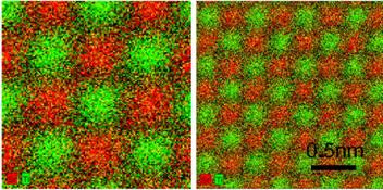 | The images show atomic-level EDX spectroscopy of the material Strontium Titanate; the individual atomic positions of the crystal structure can be easily distinguished by their chemical signal (red is Strontium, green is Titanium). These images are based on raw data, with no signal post-processing, and the individual atomic column positions in the structure are visible and clearly distinguished from their neighbors with very high contrast and signal-to-noise quality. The sampling of these atomic-level chemical maps is 0.075 Angstroms per pixel, the highest sampling density obtained so far by any atomic spectroscopy technique using scanning/transmission electron microscopy (S/TEM). These chemical maps were acquired in just minutes on a Titan™ G2 60-300 S/TEM with ChemiSTEM™ Technology. |