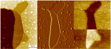 | The left hand image is the topography; the middle the topography error image; and right the electrostatic force microscopy image where the tip bias has been switched half way through the image. |