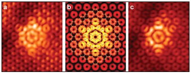 | Flower-like defects in graphene can occur during the fabrication process. The NIST team captured images of one of the defects (figures a and c) using a scanning tunneling microscope. A simulated image from their computer models (figure b) shows excellent agreement. Credit: Cockayne,Stroscio/NIST. |