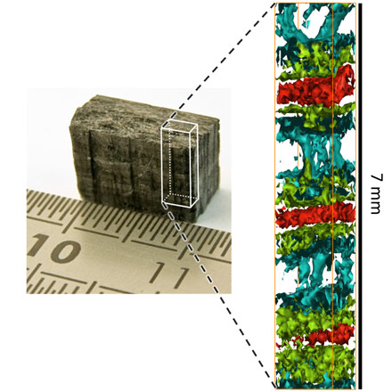 | Application of direct tomography to a layered C/SiC sample. The left part of the image shows a photograph of the sample, measuring approximately 7 x 10 x 5 mm3. The part studied with X-rays was the indicated subvolume of 7 x 2 x 1 mm3. The result, a detailed 3D map of chemical bonds, is visualised here as a set of isosurfaces within the subvolume, shown on the right, where the different colours represent the different carbon bonds present in the sample. Credit: Simo Huotari (University of Helsinki), with permission from Nature Materials. |