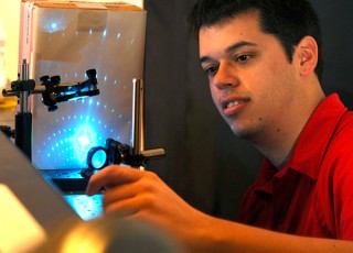 Vanderbilt graduate student Jason Ryckman demonstrates operation of a biosensor made from nanoporous materials. |