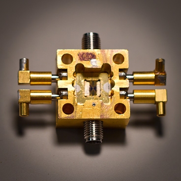 | A superconducting circuit (small square, center) fits snugly into a housing that enables it to receive electrical signals inside a cooling tank. Photo: Melanie Gonick |