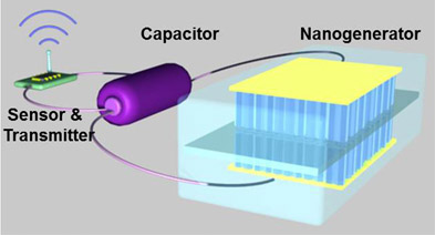 The device consists of a nanogenerator that produces electricity from mechanical vibration/triggering, a capacitor to store the energy, and electronics that include a sensor and a radio transmitter similar to those in Bluetooth mobile phone headsets. Their device transmitted wireless signals that could be detected by an ordinary commercial radio at distances of more than 30 feet.