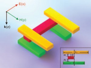 Liu explains that typical dipolar plasmon resonances are broad because of radiative damping. As a result, the simple coupling between multiple particles produces indistinct spectra that are not readily converted into distances. She and her co-authors overcame this problem with a 3D ruler constructed from five gold nanorods of individually controlled length and orientation, in which one nanorod is placed perpendicular between two pairs of parallel nanorods to form a structure that resembles the letter H.