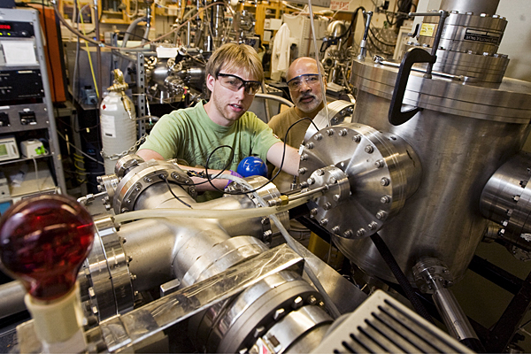 | Photo by Ambre Alexander Ismat Shah conducts nanomaterials research with undergraduate student Matt Oleksiak using a nanoparticle synthesizer. |