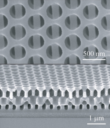 | The new 3D nanofabrication method makes it possible to manufacture complex multi-layered solids all in one step. In this example, seen in these Scanning Electron Microscope images, a view from above (at top) shows alternating layers containing round holes and long bars. As seen from the side (lower image), the alternating shapes repeat through several layers. Image: Chih-Hao Chang |