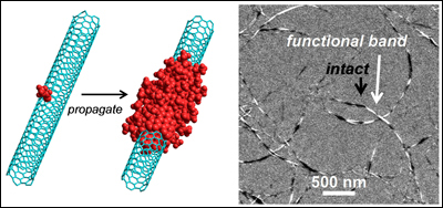 | Left: The Billups-Birch alkylcarboxylation reaction allows functional groups to propagate down the CNT from points of pre-existing defects. Right: Electron microscopy shows “banded” CNTs with distinct functionalized and intact regions along their lengths. Photo credits: Nature Communications. |