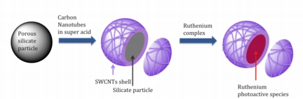The microscopic particles assembled in the lab of Angel Martí, an assistant professor of chemistry and bioengineering, combine single-walled carbon nanotubes with porous silicate materials that can absorb various molecules -- in this case, a ruthenium complex.