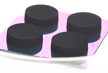 | "Cupcakes" of vertically aligned carbon nanotube arrays (VANTAs) grown on silicon, which appears blue in the photo. A chunk of VANTA can be sliced from the silicon with a razor blade and, using the blade as a spatula, easily moved to the top of a laser power detector. The very dark nanotube coating absorbs terahertz laser light. Credit: Lehman/NIST |