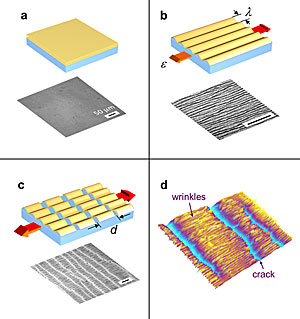 | Nanomechanical measurements (model system and microimage of typical specimen). a) thin rigid film on elastic substrate b) initial strain induces surface wrinkles parallel to stress c) additional strain induces regular pattern of cracks in the film d) typical specimen imaged with optical profilometer (280 X 210 micrometers.) Credit: Chung, Lee/NIST |