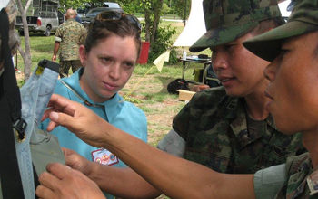 | DayOne Response, a student team funded by the National Collegiate Inventors and Innovators Allianc NCIIA in 2009, has developed a water storage/purifcation system for use in disaster relief. Here, DayOne founder and waterbag inventor Tricia Compas demonstrates the waterbag to members of the Thai military. The waterbag was tested in a joint exercize between U.S. and Thai military forces in 2010.