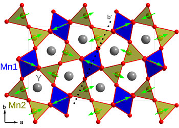 | The crystal structure of YMn2O5, which is made of yttrium, manganese, and oxygen. The oxygen atoms are shown in red and the yttrium atoms are gray. The magnetic moments on the manganese are shown as arrows. Ferroelectric polarization occurs between the oxygen and manganese atoms. |