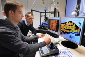 | Professor Robert Magerle (right) watches Eike-Christian Spitzner working with the JPK NanoWizard AFM |