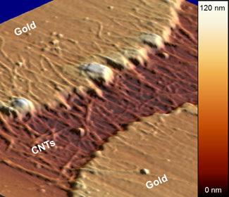 While many researchers around the world are studying nanotube fabrication and properties, the NIST work offers an early look at how these materials may behave in real electronic devices over the long term. To support industrial applications of these novel materials, NIST is developing measurement and test techniques and studying a variety of nanotube structures, zeroing in on what happens at the intersections of nanotubes and metals and between different nanotubes. "The common link is that we really need to study the interfaces," says Mark Strus, a NIST postdoctoral researcher.