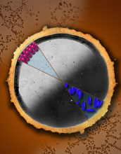 | This illustration represents a how a dried drop would appear if it contained round particles (red) or elongated particles (blue).