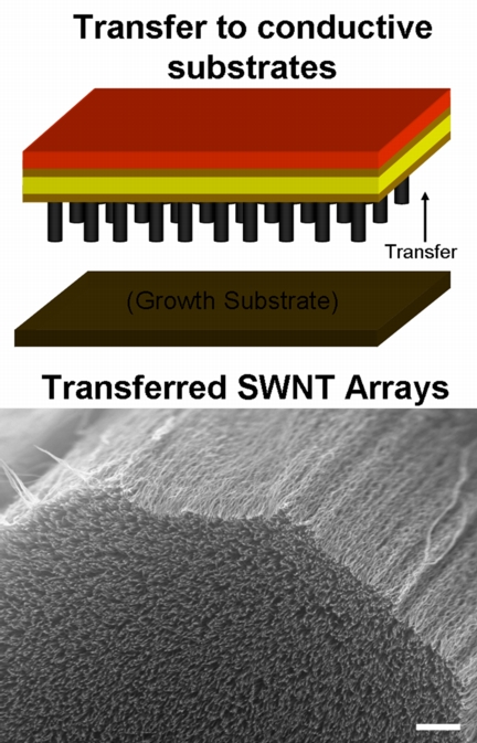 For the new device, the Rice team grew an array of 15-20 nanometer bundles of single-walled carbon nanotubes up to 50 microns long. Hauge, a distinguished faculty fellow in chemistry, led the effort with former Rice graduate students Cary Pint, first author of the paper and now a researcher at Intel, and Nolan Nicholas, now a researcher at Matric.