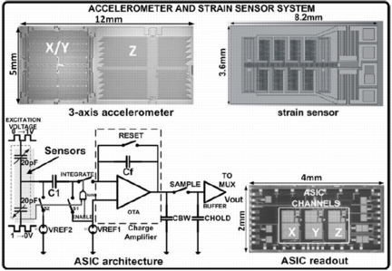 | Figure MEMSreadout: Microphotographs of the accelerometer, strain sensor and readout ASIC and topology of a single channel capacitive readout. |