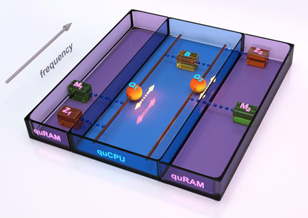 UCSB physicists have demonstrated a quantum integrated circuit that implements the quantum von Neumann architecture. In this architecture, a long-lived quantum random access memory can be programmed using a quantum central processing unit, all constructed on a single chip, providing the key components for a quantum version of a classical computer.