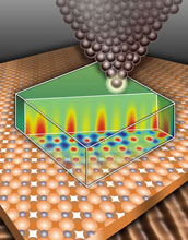 | This image shows an artistic rendering of the metal tip of the special microscope used to perform 3D force field mapping of materials at Yale University. The microscope is a unique combined scanning tunneling/atomic force microscope that can operate at temperatures close to absolute zero. It can simultaneously map out the chemical and electrical properties of surfaces at the atomic scale, while also describing the precise layout and identity of the atoms that make up the surface of the material.