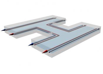 | In a topological insulator, electrons travel unimpeded along the edges of the sample, regardless of where they enter or leave it. They travel in a direction perpendicular to the direction of their spin. In this diagram based on a sample of mercury telluride, red arrows correspond to electrons with "spin up," blue, "spin down." An electron injected into one leg of the "H" can end up in the other without bumping into other electrons or defects in the bulk of the material, and hence without any resistance. (Image courtesy Shoucheng Zhang) |