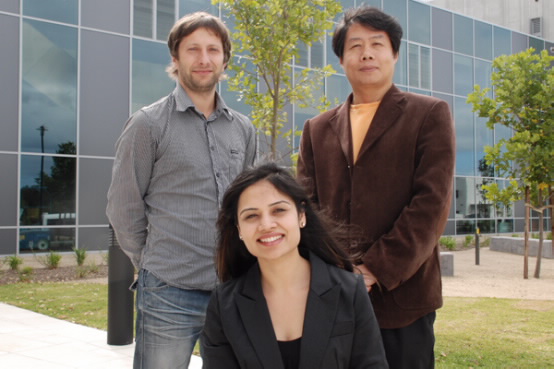 | PhD candidate Priyanka Jood is pictured with her supervisors Dr Germanas Peleckis and Professor Xiaolin Wang close |